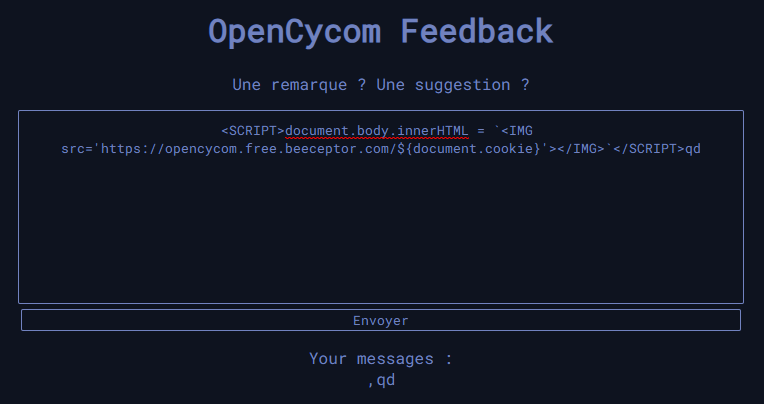 Ici, mon script ajoute une simple balise img, qui va charger une image sur mon site malveillant, avec le cookie de l’administrateur.