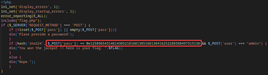 $_GET['pass']et le hash est une comparaison “faible”, elle compare après le transtypage - Le hash du mot de passe de l’administrateur commence par