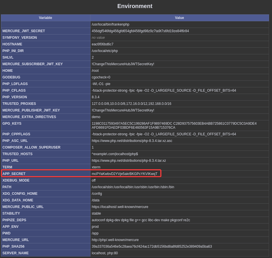 Et coup de bol, le token APP_SECRET figure parmi les variables d’environnement exposées sur le PHPInfo.