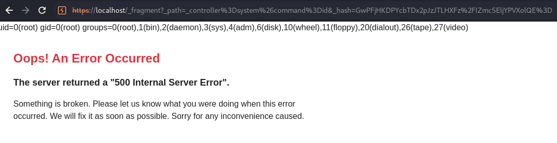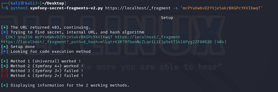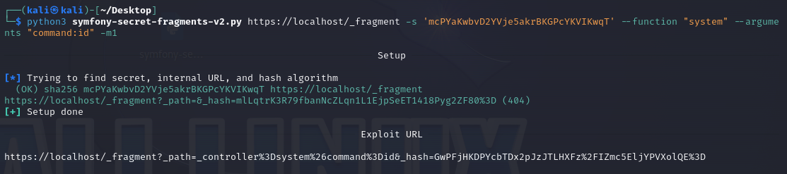 Avec ces infos, on peut maintenant utiliser l’endpoint /_fragment pour obtenir une execution de commande sur l’application. Il existe des scripts qui font pratiquement tout à notre place, comme par exemple symfony-secret-fragments-v2.py