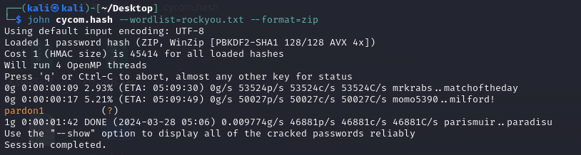 john cycom.hash --wordlist=rockyou.txt --format=zip