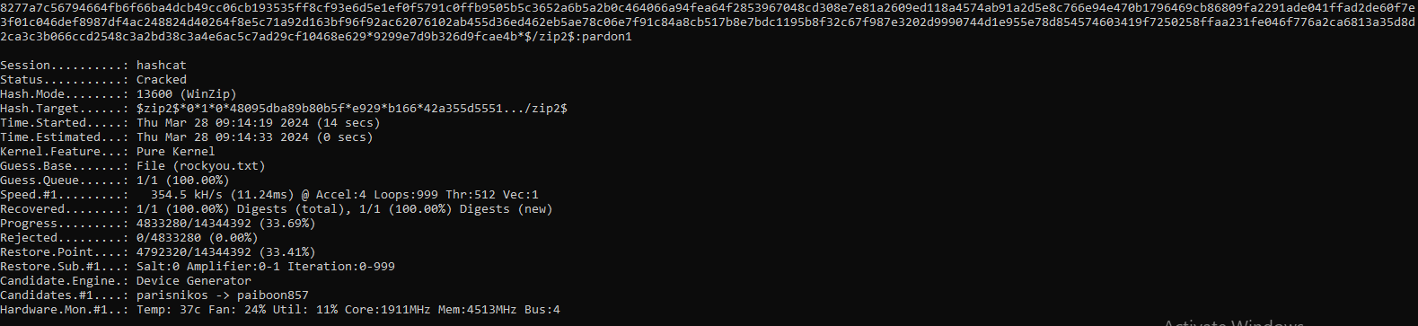 On récupère d’abord le hash du fichier avec zip2john, afin d’avoir un format utilisable pour les outils hashcat et john