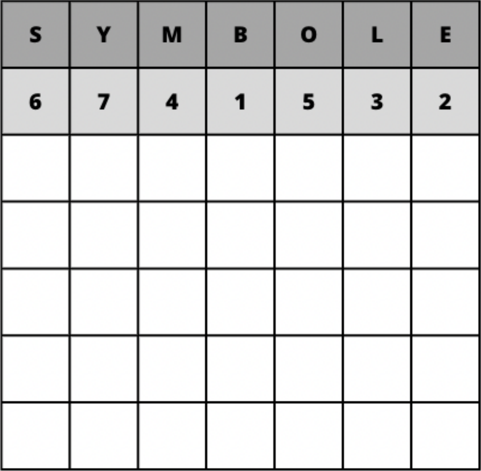 Comme le cryptogramme comporte 34 lettres, il faudra 5 lignes. Cependant comme 5(lignes)x7(colonnes)=35 cases, il y aura (35 cases - 34 lettres) une colonne incomplète, qui ne comporta que 4 lignes.